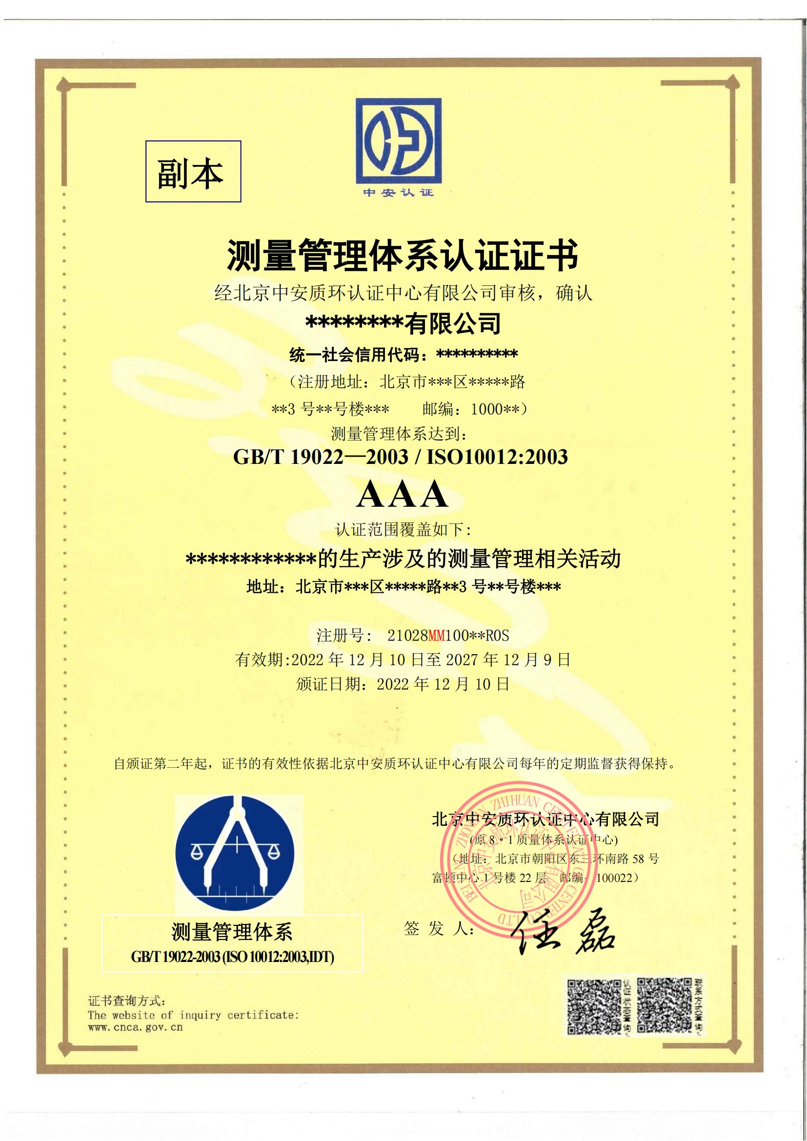 (1)AAA级证书:是对我国企业的测量管理体系能力的最高认可,,表明一个组织所运行的测量管理体系符合ISO10012测量管理体系标准的全部要求。。。。